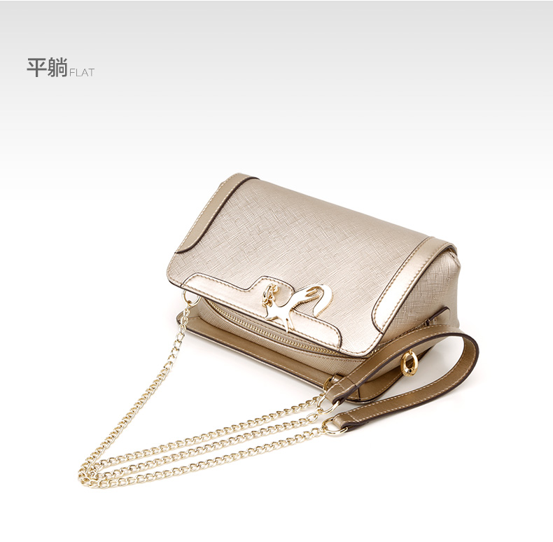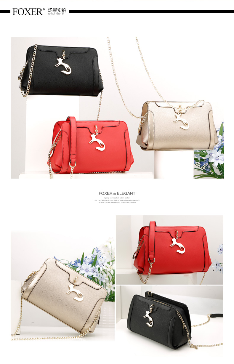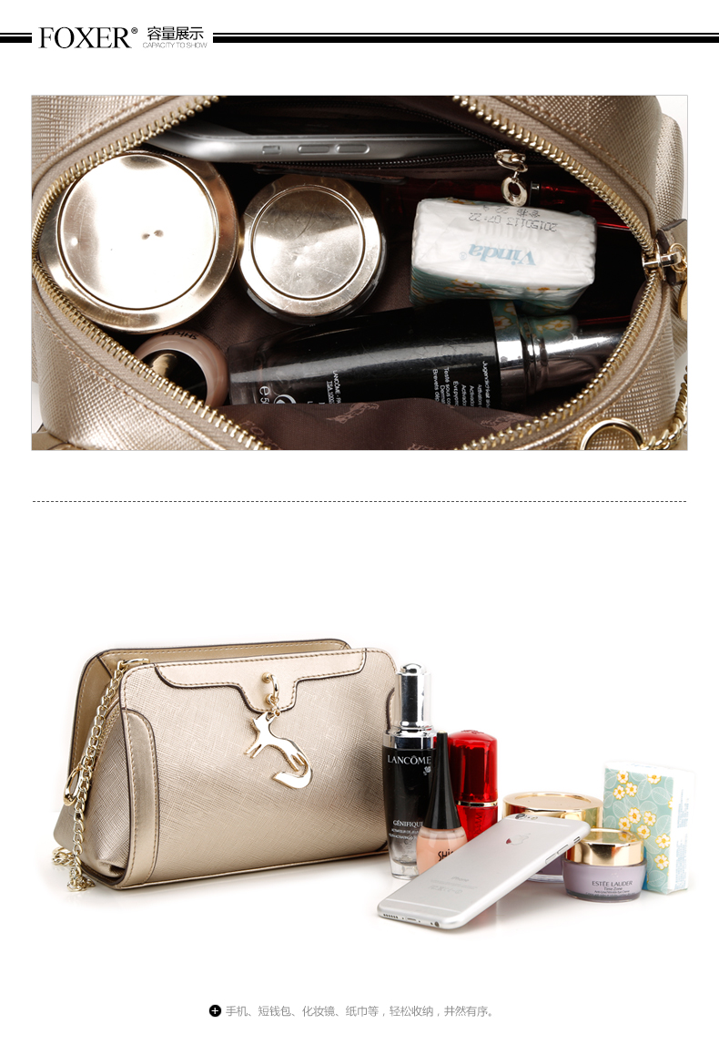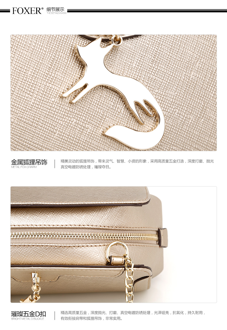 > 金狐狸(FOXER)女包2016新款小香风链条牛皮女士小包包时尚狐狸吊坠手提单肩斜挎包5F 金 色