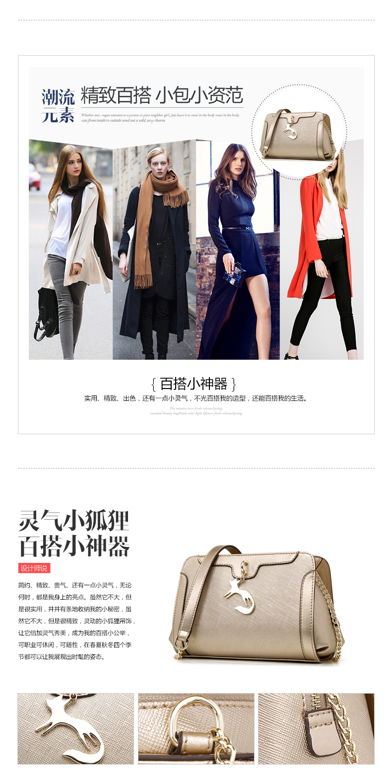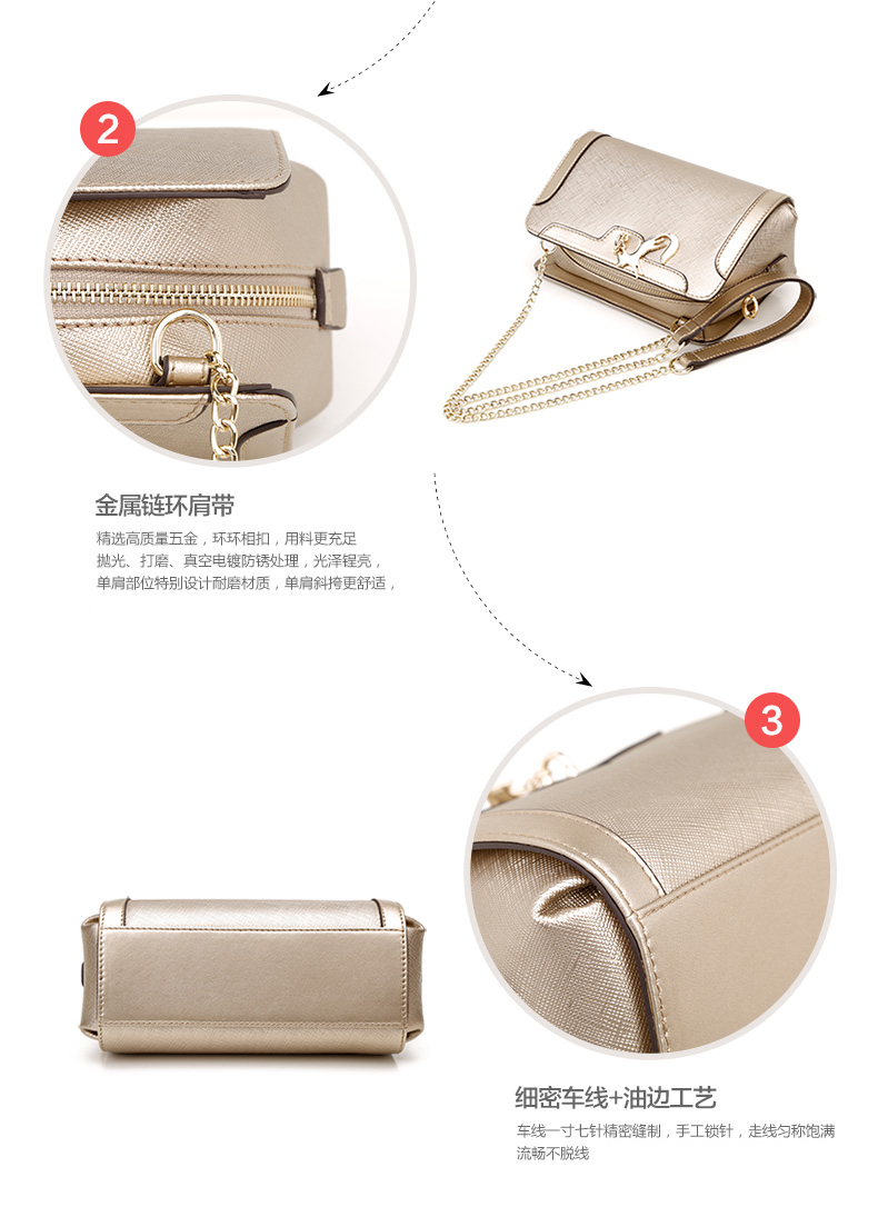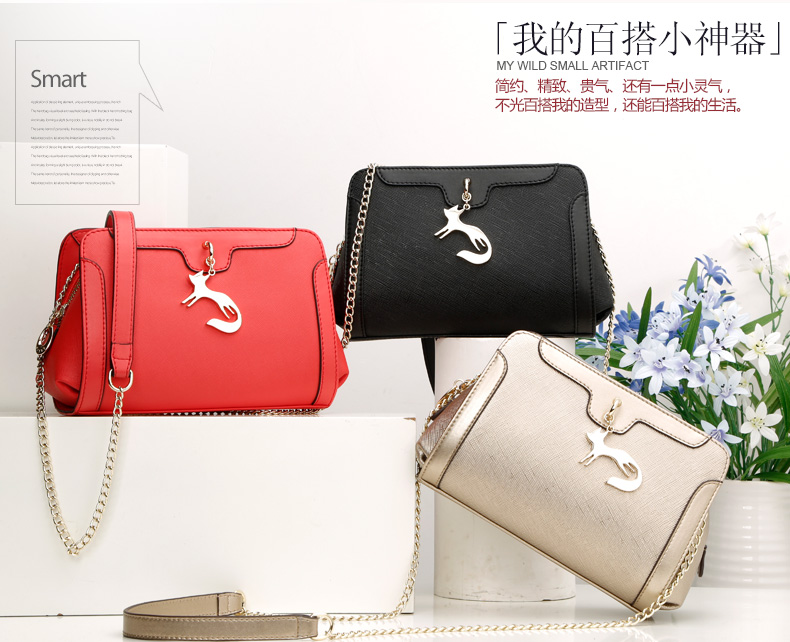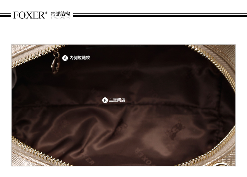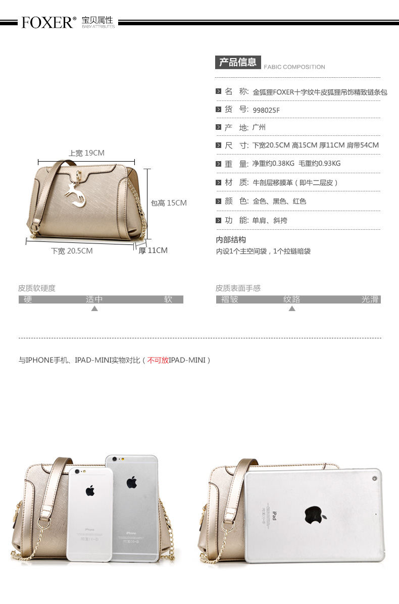 > 金狐狸(FOXER)女包2016新款小香风链条牛皮女士小包包时尚狐狸吊坠手提单肩斜挎包5F 金 色