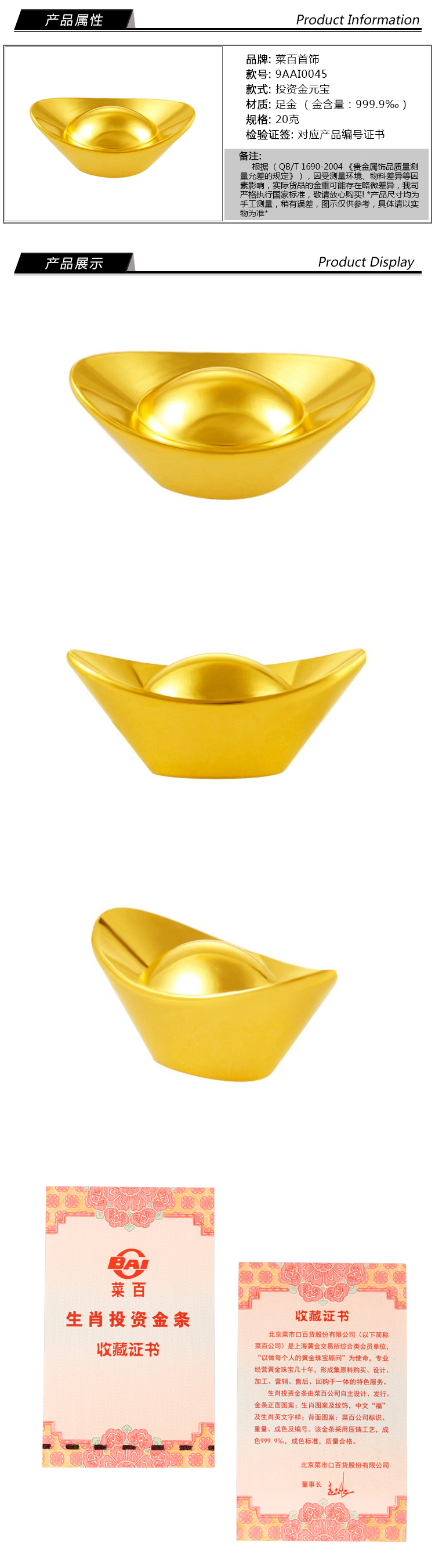 > 菜百首饰 20克投资金元宝 Au9999黄金投资金元宝 菜百投资金条 支持回购