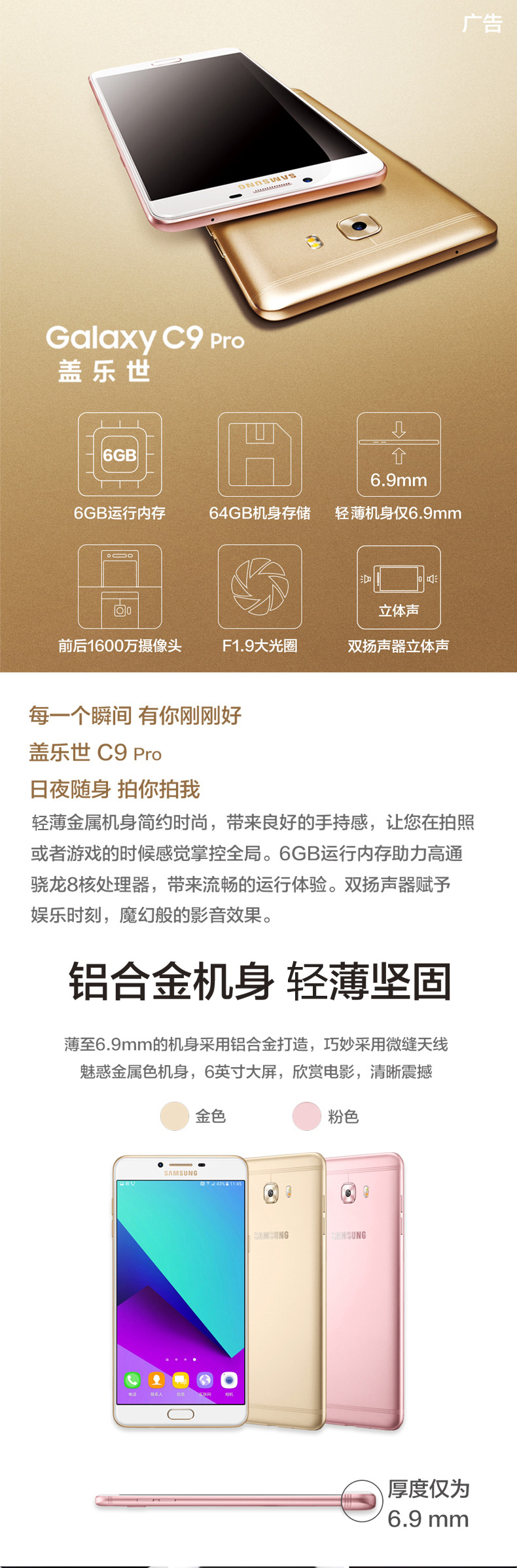 > 三星 Galaxy C9 Pro(C9000)6GB+64GB 枫叶金 全网通 4G手机 双卡双待