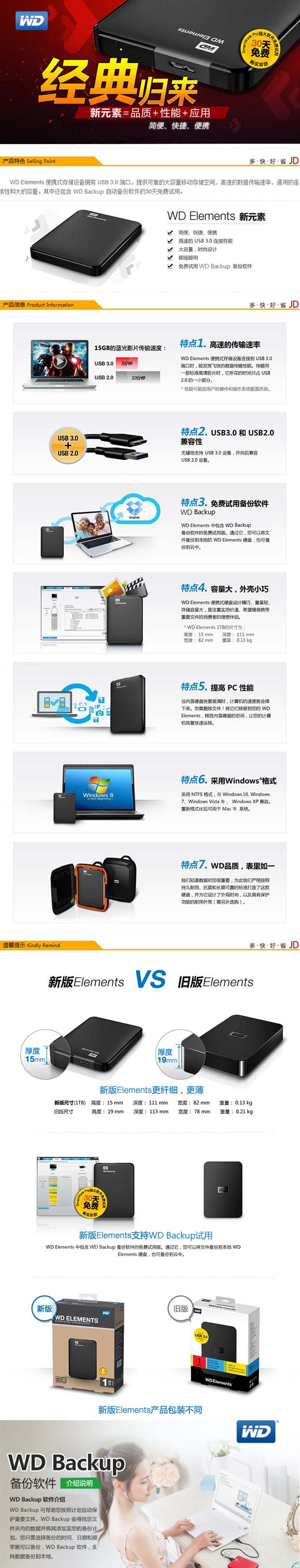 > 西部数据(WD) Elements 新元素系列 2.5英寸 USB3.0 移动硬盘 1TB(WDBUZG0010BBK)