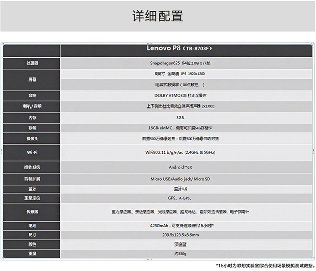 > 联想 P8 平板电脑 8英寸(高通625 八核 3G/16G 1920X1200 )深邃蓝 WIFI版
