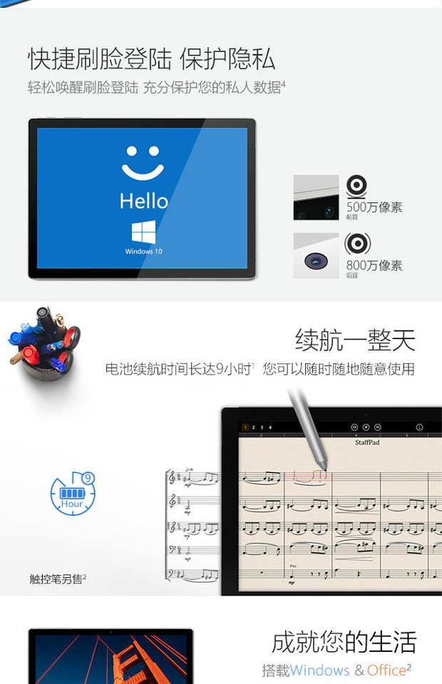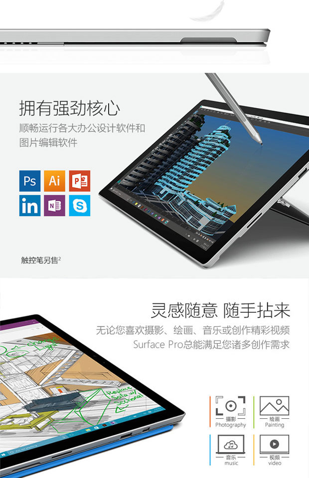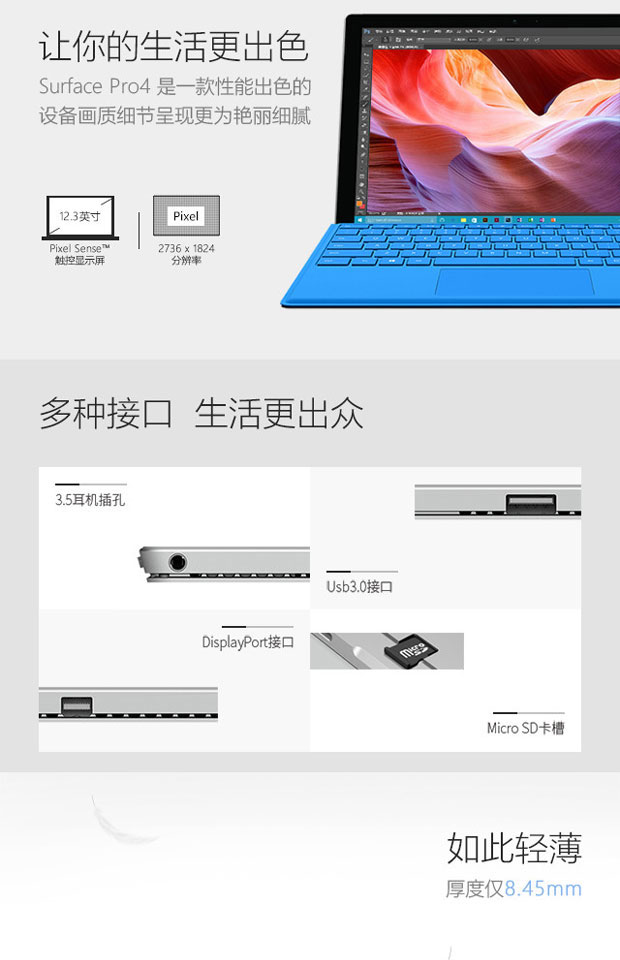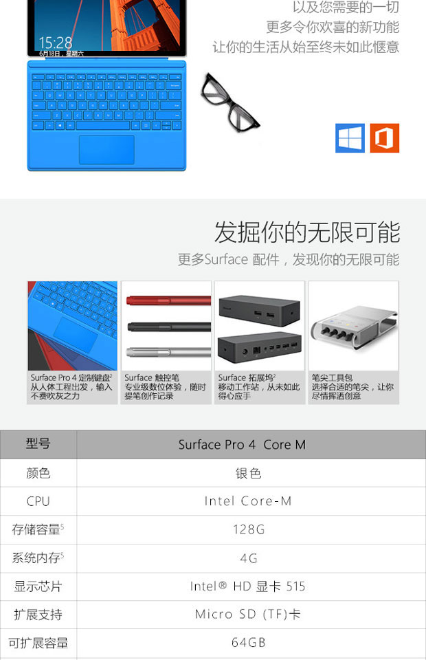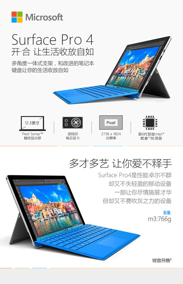 > 微软(Microsoft)Surface Pro 4 二合一平板电脑 (Intel Core M3 4G内存 128G存